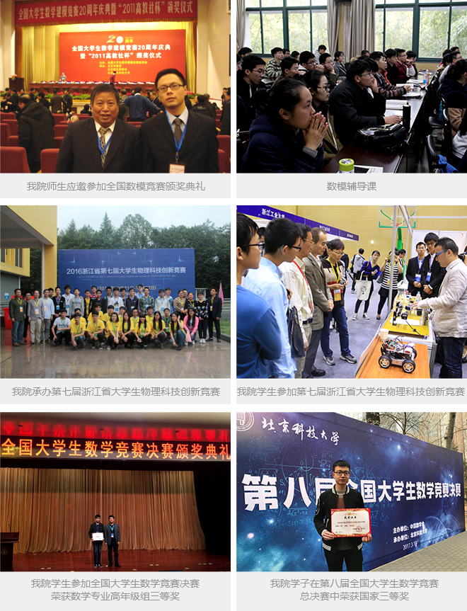 近年来,由HO5HO负责指导的我校国际大学生数学建模竞赛、全国大学生数学建模竞赛、全国大学生数学竞赛、浙江省大学生高等数学竞赛、浙江省大学生物理创新(科技)竞赛、浙江省大学生物理创新(理论)竞赛和“泰迪杯”数据挖掘挑战赛,共取得国际一等奖2项、二等奖7项、三等奖5项,全国一等奖80项、二等奖122项、三等奖186项、优胜奖110项,浙江省一等奖255项、二等奖591项、三等奖1166项。