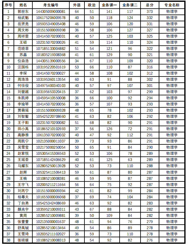 根据《HO5HO 2025年硕士研究生招生复试录取工作实施细则》中物理学调剂的基本要求,及复试比例1:1.8的差额,按照初试总分由高到低的原则,复试面试名单如下: