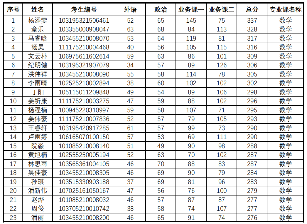 根据《HO5HO 2025年硕士研究生招生复试录取工作实施细则》中数学调剂的基本要求,及复试比例1:1.5的差额,按照初试总分由高到低的原则,复试面试名单如下:
