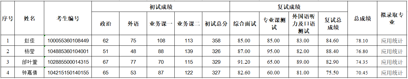经考生初试、复试等各个环节,学院招生工作领导小组确认,现对拟录取的考生进行公示(详见下表),公示时间为2025年4月19日至4月25日(七天),如有疑义,请以书面的形式反映,反映问题要实事求是,署本人真实姓名。