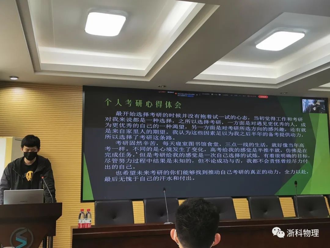 孙婷婷老师为本次交流会做了开场白。孙老师首先强调了考研的重要性和必要性,鼓励了同学们通过考研走向更大更强的平台,从而开阔自己的眼界,提升竞争力。然后,孙老师对取得优异考研成绩的18级同学表示了热烈的祝贺,并预祝他们在新的平台给母校增光添彩。接着,孙老师建议学弟学妹们认真聆听和学习学长们的考研经验汇报,借鉴学习方法,吸取经验教训,做出最适合自己的选择,坚定自信地走上考研这条路。最后,孙老师表达了对19级、20级同学们的期待和祝福,愿浙科物理的学子都能有美好的前途。