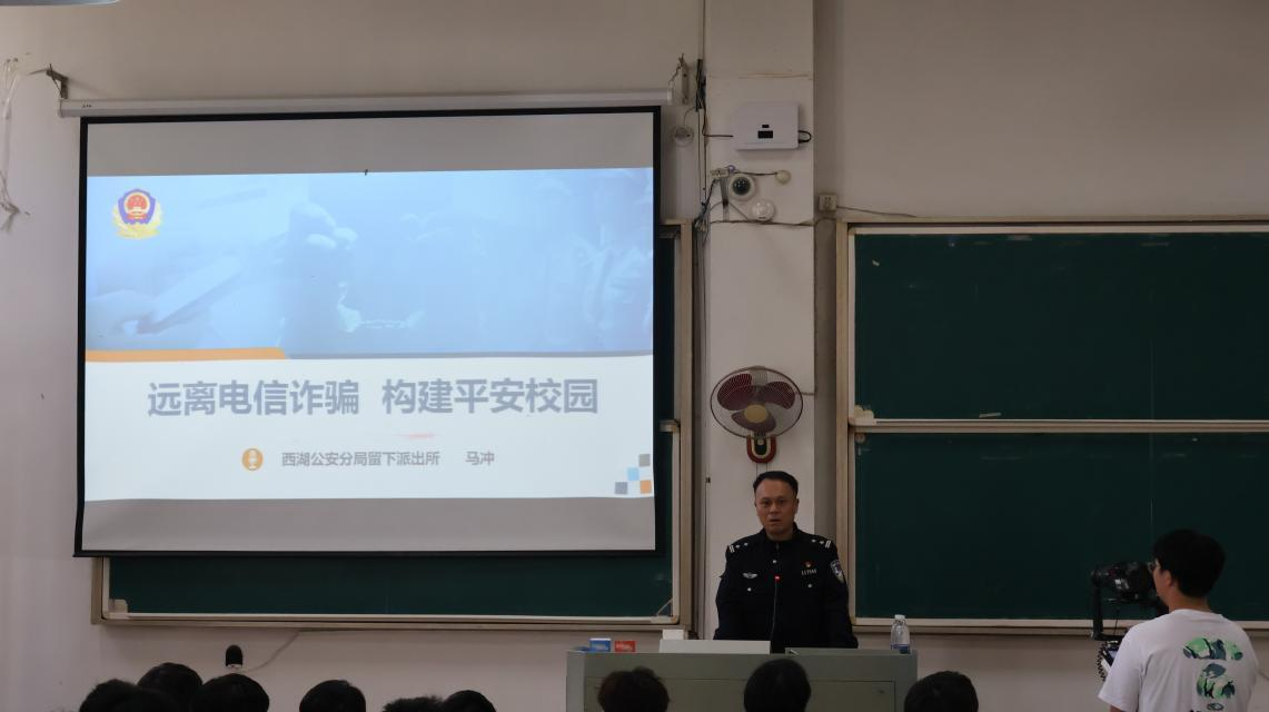 2024年4月18日14:30,为持续强化学生安全教育工作,引导学生树立正确的安全观,共同维护和营造学校安全稳定的校园环境,切实增强学生的安全意识,防诈骗意识,HO5HO特邀请西湖公安分局留下派出所马冲警官为同学们开展了一场“远离电信诈骗,构建平安校园”的专题讲座,HO5HO各年级辅导员、各班班委、寝室长、学生代表参与本次讲座。
