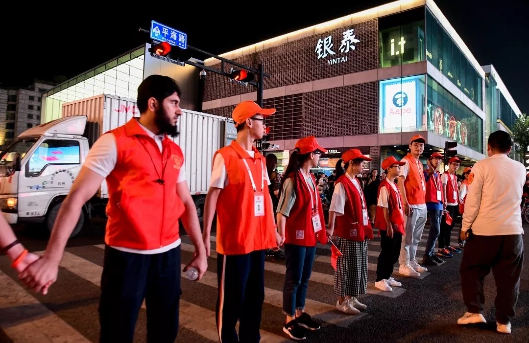 在这道靓丽的风景线中出现的我校留学生,他们作为国际志愿者,连续七天参与到上城区湖滨步行街的志愿活动中。一句句“请快速通行”、“不要低头玩手机”等简短流利的中文提醒着行人和游客们注意安全,在秋意渐浓的夜晚温暖着每个人的心房。