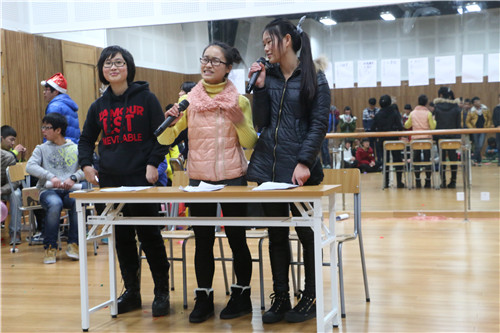 清脆、甜美的歌声,拉开晚会的序幕。圣诞节日的气氛,在同学们间迅速漫开,经过简单的分组,同学们迅速进入到第一个游戏“抢椅子”,围着椅子,同学们展开了激烈的角逐。如果说抢椅子同学们灵活的身姿的体现,那么“五毛一块”则是智慧的比拼。每组分别派出一位男、女同学,男女同学用智慧展开对决,比赛关键时刻,出现“二女争一男”,真是险象环生、惊心动魄。