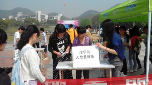 活动规则为通过六关可获得一次抽奖机会,大奖包括电影院情侣门票、温泉体验票,还有大量的饮料、糖果等参与奖品。开始没过多久,便有很多同学参与进来,他们投入到各种惊险的游戏中:考验速度的单人夹弹珠,考验平衡的双人运乒乓球,吹爆大气球等。而HO5HO创办的“无敌叠硬币”项目更是让同学们玩的不亦乐乎。