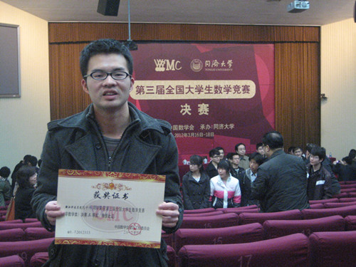 HO5HO应用物理082班的陈中师同学在去年10月举行的全国预赛(500余所本科院校的43600余名学生参加)中成绩优秀,成功入围本次决赛,最终荣获非数学专业类三等奖,为学校争得了荣誉。