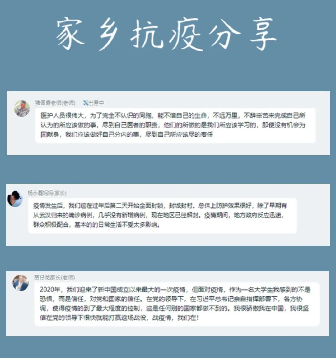 信计182团支书组织大家集体学习了习近平总书记关于新冠肺炎疫情防控工作的重要讲话和重要指示精神,并从多方面讲解了关于“停课不停学”的相关内容,做到坚定信念理性思考、积极响应主动配合、科学规划动静结合、调整状态全心投入、自我规范严守纪律。战“疫”微团课上,亲身参加防疫志愿工作的班级志愿者主动分享他们的战“疫”故事,弘扬战“疫”正能量。最后,班主任张永帅带领大家书写“武汉加油!中国加油!”,为表决心,同学们一起开麦喊出加油口号!声援武汉,你我同在!