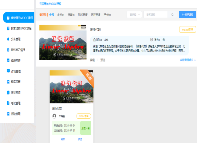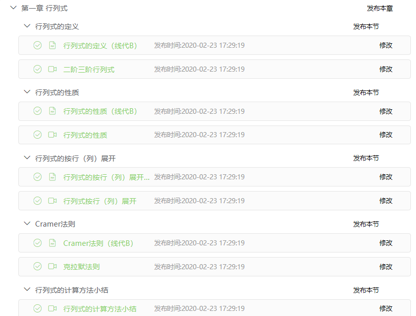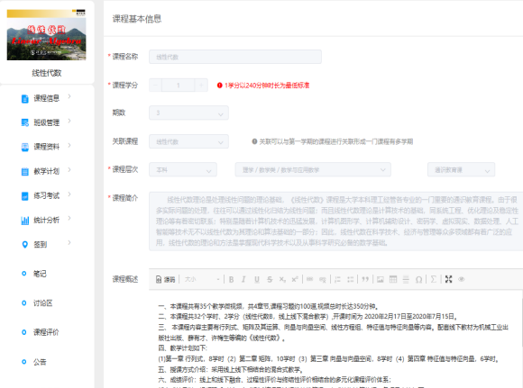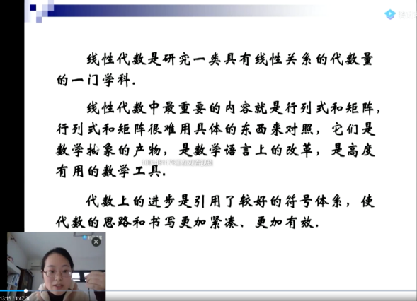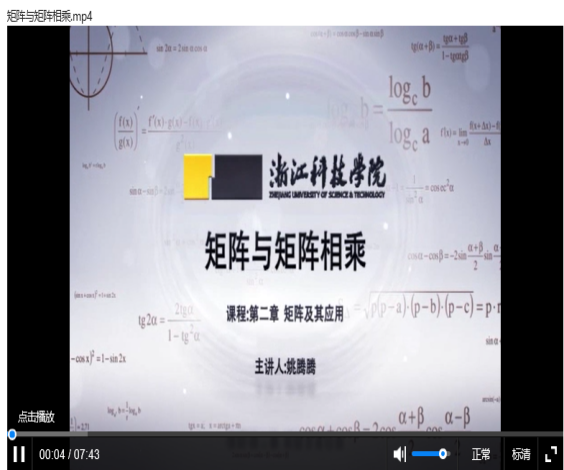 针对学生,以章节的形式提前在浙江省高等学校在线开放课程共享平台上发布即将学习的微课视频,本课程共有35个教学微视频约100道习题,视频包括线性代数四个章节的内容,每个微课视频时长10分钟左右,由浙江科技学院HO5HO