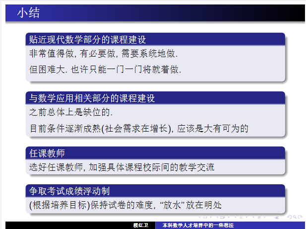 随后,楼教授和与会教师们讨论了目前数学教学方面的现状和建议,提倡“无学分讨论班”,认为这种教学方式灵活、有利于发挥教师专长,利于学生尽早接触数学应用,发现学术兴趣点,值得尝试!会上还讨论了“课程内容完整性”选择,认为应该不避开困难的内容,尽早讲完整、讲透,但是可以不作为考核要求!最后还就考试难度方面进行了分析,认为降低卷面难度不可取,会打击优秀学生积极性,同时使得目标第的学生进一步降低对自身的要求,恶性循环!那为了达到学校要求的及格率怎么解决呢?楼教授建议采取成绩浮动制,把“及格线”交给老师,“放水”放在明处!