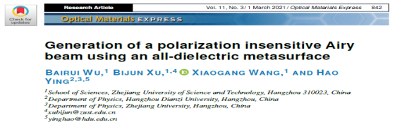 近日,HO5HO应用物理系2019级研究生吴白瑞同学在徐弼军指导下以第一作者身份在美国光学学会旗下的国际知名学术期刊《Optical Materials Express》(影响因子3.064,中科院二区)上发表一篇高质量学术论文,报道了他们在超构表面产生特殊光束的最新研究成果。浙江科技学院为第一署名单位,徐弼军老师为论文通信作者。