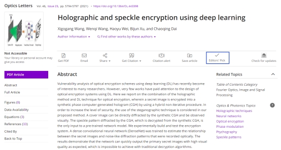 近日,HO5HO应用物理系光学团队汪小刚教授在美国光学学会(OSA)旗下著名学术期刊Optics Letters (影响因子:3.776,浙大top100) 上发表了题为“Holographic and speckle encryption using deep learning”的研究论文,该论文被选为Editor's Pick(编辑精选,代表特定领域内具有高科学价值的工作)(Editor's Picks serve to highlight articles with excellent scientific quality and are representative of the work taking place in a specific field)。