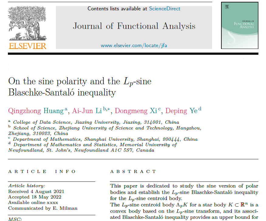 近日,HO5HO数学与统计系李爱军教授(通讯作者)与嘉兴学院黄卿中博士、上海大学席东盟博士、加拿大纽芬兰纪念大学叶德平教授合作在国际权威数学期刊《Journal of Functional Analysis》上在线发表了题为“On the sine polarity and the Lp-sine Blaschke-Santaló inequality”的学术论文。