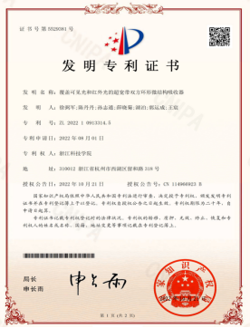 2、研究团队2021级研究生陈丹丹同学以第一作者身份在期刊《Optics Communications》上发表了题为“Ultra-broadband dual-square ring metamaterial absorbers from visible to far-infrared region”的研究论文。浙江科技学院为第一完成单位,应用物理系徐弼军和汪小刚分别为论文通讯作者和共同指导教师。《Optics Communications》是爱思唯尔(Elsevier)旗下的光通信领域前沿期刊,2021-2022年的影响因子2.335, SCI中科院三区。
