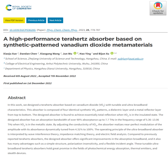 1、研究团队中2020级研究生薛晓菊以第一作者身份在《Physical Chemistry Chemical Physics (PCCP)》 期刊上发表了题为“High-performance terahertz absorber based on synthetic-patterned vanadium dioxide metamaterials”的创新研究文章。浙江科技学院为第一完成单位,应用物理系徐弼军和汪小刚分别为论文通讯作者和共同指导教师。《Physical Chemistry Chemical Physics (PCCP)》是英国皇家化学学会(RSC)旗下著名期刊,2021-2022年的影响因子3.945,中科院分区SCI二区TOP期刊。