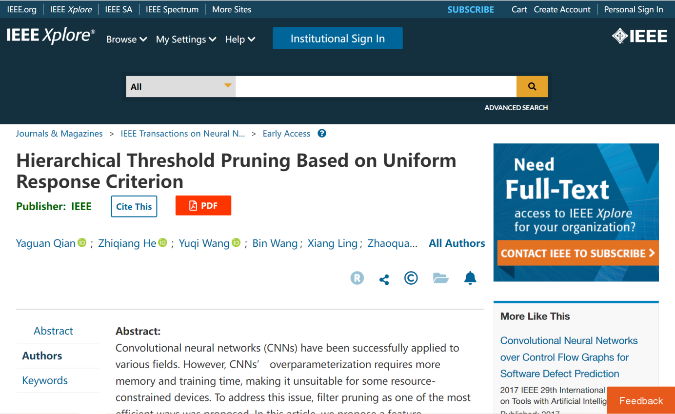 HO5HO机器学习与数据科学团队(人工智能安全课题组)一篇论文《Hierarchical Threshold Pruning Based on Uniform Response Criterion》在人工智能领域顶级期刊IEEE Transactions on Neural Networks and Learning System上发表。IEEE TNNLS是人工智能领域的旗舰期刊,中科院一区,最新SCI影响因子为14.255。论文以我校为第一单位,钱亚冠老师为第一作者,与浙江省多维感知重点实验室、中科院软件所、哈工大(深圳)、电子科大湖州研究院等单位共同合作完成。论文提出新的剪枝策略,克服了深度神经网络剪枝过程中的层崩塌问题,使得神经网络在极低的剪枝率下仍能保持层间连接的完整性。