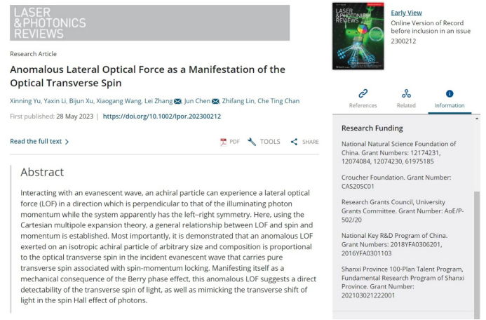 光子与光场调控及应用研究团队在“倏逝场的横向光力”领域取得重要进展,研究成果以浙江科技学院为第一单位在国际顶级期刊Laser & Photonics Reviews(影响因子10.947,中科院分区SCI一区TOP)在线发表了题为“Anomalous lateral optical force as a manifestation of the optical transverse spin”的论文(链接://doi.org/10.1002/lpor.202300212)。青年教师俞昕宁为该论文的第一作者,徐弼军教授和汪小刚教授分别为论文的共同作者。该研究得到了国家自然科学基金、国家重点研发计划、香港AoE项目等的支持。