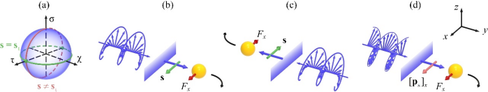 为了清晰阐明横向光力的物理机制,研究团队基于光力的多极展开法研究发现:(1)任意尺寸球粒在倏逝场中所受光力与四类电磁场量有关,即:能量密度梯度∇w、轨道动量po、Belinfante自旋动量ps以及自旋角动量s。其中,前两类场量∇w和po分别诱导梯度力和辐射压力,与横向x无关。后两类场量ps和s诱导横向光力Fx。(2)当倏逝场的自旋s满足自旋动量锁定条件时,横向Belinfante自旋动量为零,从而横向光力仅正比于横向自旋,如图(b)和(c)所示。(3)当倏逝场自旋s同时包含横向自旋和纵向自旋时,此时横向光力正比于横向Belinfante自旋动量,如图(d)所示。