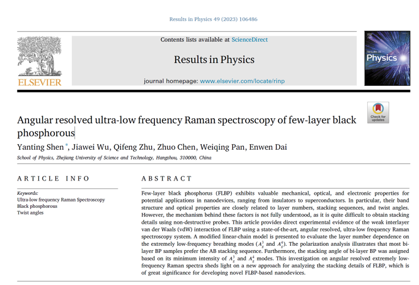 光学感知与通信团队在“少层黑磷堆垛研究”领域取得重要进展,研究成果以浙江科技学院为第一单位在国际期刊Results in Physics(影响因子4.565,中科院SCI二区,JCR Q1)发表了题为“Angular resolved ultra-low frequency Raman spectroscopy of few-layer black phosphorous”的论文(链接://doi.org/10.1016/j.rinp.2023.106486)。青年教师沈艳婷为该论文的第一作者,研究生吴家伟为第二作者,潘卫清教授和戴恩文研究员为共同作者。该研究得到了国家自然科学基金、浙江省自然科学基金、浙江科技学院研究生创新研究基金等的支持。