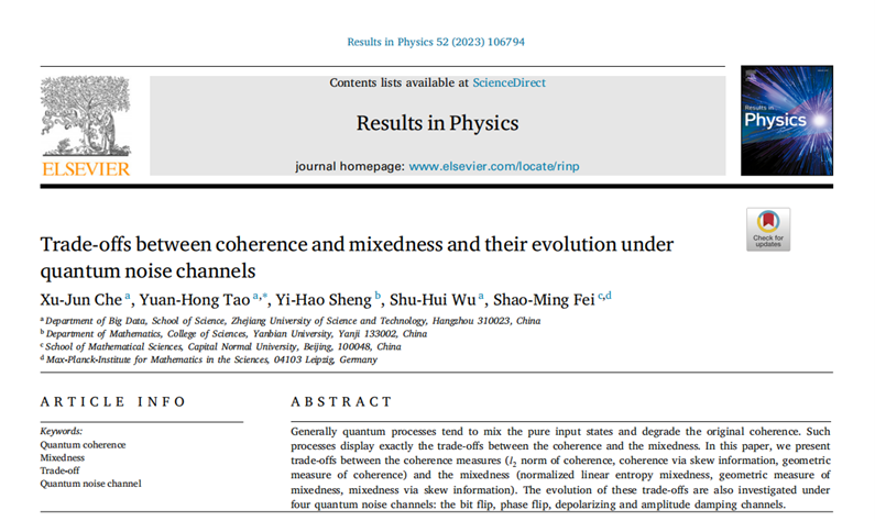近日,HO5HO中法大数据2020级本科生车徐骏以第一作者身份在《Results in physics》期刊上发表了题为“Trade-offs between coherence and mixedness and their evolution under quantum noise channels”的科研文章。《Results in physics》是ELSEVIER旗下中科院分区SCI二区期刊。浙江科技学院为第一完成单位,大数据科学系陶元红为论文通讯作者,吴淑慧为共同指导教师。