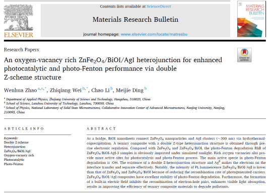 量子关联物质研究团队在“能源材料光催化降解污染物”研究中取得重要进展,研究成果以论文形式发表在国际期刊《Materials Research Bulletin》上(IF: 5.4,中科院二区),论文题目为“An oxygen-vacancy rich ZnFe2O4/BiOI/AgI heterojunction for enhanced photocatalytic and photo-Fenton performance via double Z-scheme structure”。青年博士赵文华为该论文的第一作者和通讯作者,浙江科技学院为第一单位。该研究得到了国家自然科学基金、甘肃省自然科学基金、浙江科技学院基础科研业务基金的支持。