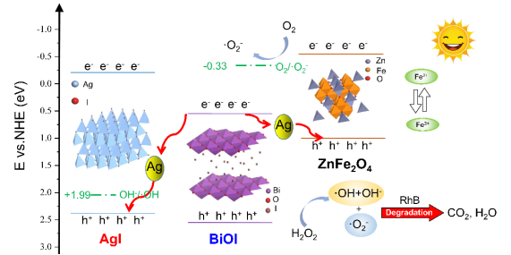 该研究中,BiOI纳米片作为桥梁,采用水热-共沉淀法巧妙连接了ZnFe2O4纳米颗粒和AgI团簇,通过电子调控构建出具有双Z型异质结结构的ZnFe2O4/BiOI/AgI。由于降低了光生载流子的复合率,ZnFe2O4/BiOI-AgI-3样品在模拟太阳光下的光芬顿降解RhB明显提高。值得注意的是,双Z异质结结构和Ag0的存在使界面上的电子有效地转移和分离。同时,富氧空位也为光催化和光芬顿过程提供了更多的活性位点。光芬顿降解中主要活性物种是⋅OH。内建电场的形成抑制了电子-空穴对的复合,增强了可见光吸收,导致三元复合材料降解污染物的效率提高,这在光催化领域具有指导性意义。(应用物理系 孙婷婷)