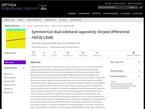 应用物理系光子与光场调控研究团队在FMCW激光雷达研究方面取得重要进展,相关研究成果以论文形式发表在国际光学领域知名期刊《Optics Express》(影响因子3.8,中科院SCI二区,JCR Q1)上。论文题为“Symmetrical dual-sideband oppositely chirped differential FMCW LiDAR”,职亚楠为论文第一作者/通讯作者,研究生孙玉娇为第二作者,浙江科技学院为第一署名单位。