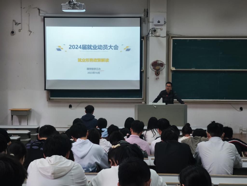 2024届毕业生就业动员大会在闻理园A3-125顺利召开。HO5HO党委副书记黄奕筱出席大会并讲话,学工办主任蔡瑞康、就业辅导员汪昊和2020级全体学生参加本次大会。