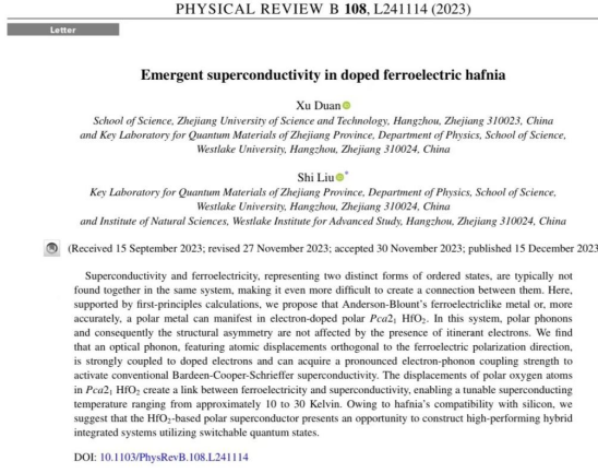 近日,HO5HO量子关联物质研究团队的段旭博士在国际著名物理学术期刊Physical Review B上在线发表了题为“Emergent superconductivity in doped ferroelectric hafnia”的论文[Phys. Rev. B 108, L241114(2023)]。 浙江科技大学为第一单位,青年教师段旭为第一作者,西湖大学刘仕教授为通讯作者。该研究得到了国家自然科学基金的支持。