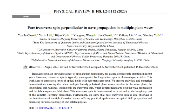近日,HO5HO光子与光场调控研究团队中2021级研究生陈远路以第一作者身份在《Physical Review B》期刊上发表了题为“Pure transverse spin perpendicular to wave propagation in multiple plane waves”的创新研究文章。HO5HO