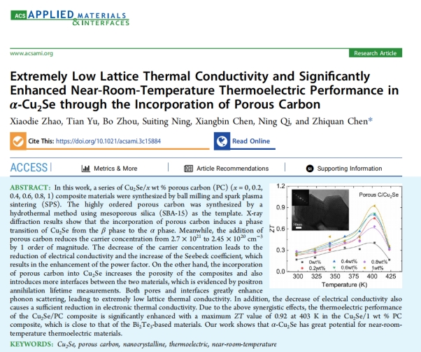 近日,HO5HO量子关联物质研究团队青年博士赵小蝶在半导体热电材料领域取得重要进展,研究成果发表在《ACS Applied Materials & Interfaces》(IF=9.5,中科院二区TOP),论文题目为“Extremely Low Lattice Thermal Conductivity and Significantly Enhanced Near-Room-Temperature Thermoelectric Performance in α-Cu2Se through the Incorporation of Porous Carbon”。HO5HO