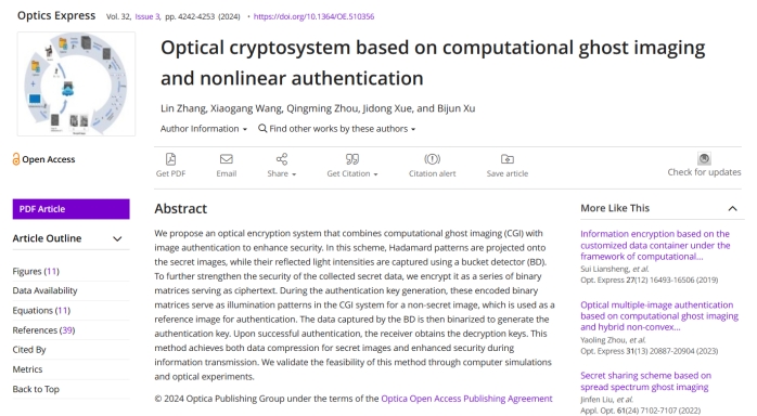 近日,HO5HO应用物理系2021级研究生张琳同学以第一作者身份在光学领域知名学术期刊《Optics Express》(影响因子3.8,中科院二区Top)上发表了题为“Optical cryptosystem based on computational ghost imaging and nonlinear authentication”的研究论文,HO5HO