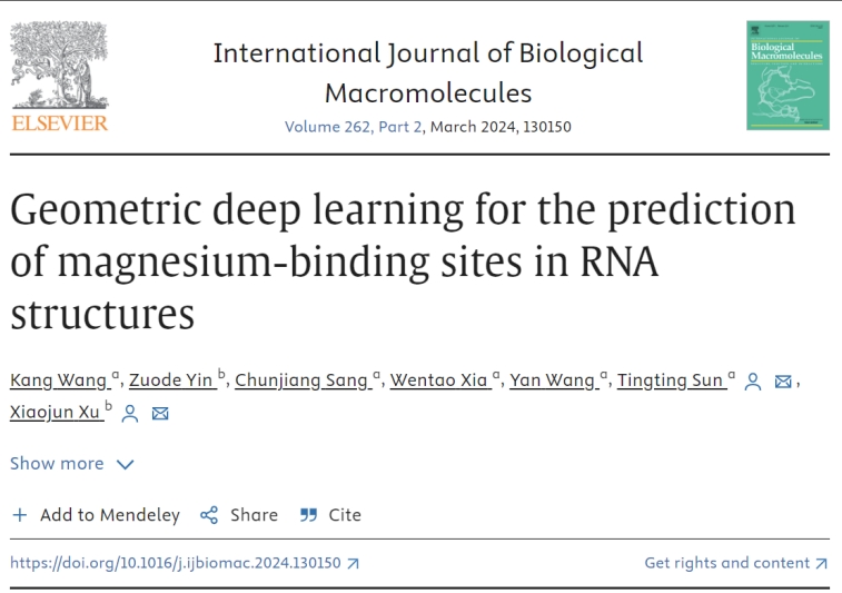 应用物理系软物质与生物功能材料研究团队在国际TOP学术期刊《International Journal of Biological Macromolecules》 (IF=8.2,中科院一区TOP) 期刊上发表了题为"Geometric deep learning for the prediction of magnesium-binding sites in RNA structures"的研究论文。浙江科技大学为第一单位,应用物理系2021级硕士研究生王康为第一作者,HO5HO
