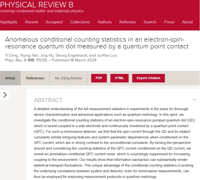 近日,HO5HO与罗马尼亚巴比什-博雅依大学联合培养博士研究生丁一同学以第一作者在国际权威物理学术期刊《Physical Review B》上发表了题为"Anomalous conditional counting statistics in an electron-spin-resonance quantum dot measured by a quantum point contact”的研究论文,物理系骆钧炎教授为论文通讯作者,颜益营副教授、南方科技大学Georg Engelhardt副研究员为共同指导教师。《Physical Review B》是由美国物理学会(American Physical Society)主办的学术期刊之一,影响因子3.908,中科院二区TOP期刊,是凝聚态物理方面最有影响力和最权威的期刊之一,也是自然指数(Nature Index)收录的全球82个顶级期刊之一。