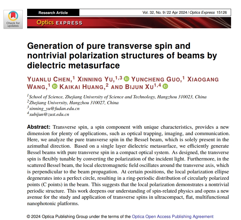 为第一单位,浙江大学为合作单位,应用物理系徐弼军教授和俞昕宁博士为论文通讯作者,汪小刚教授为共同指导教师。《Optics Express》是美国光学学会旗下期刊,中科院二区TOP,影响因子3.8。