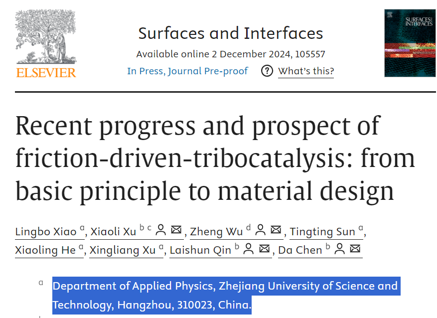 应用物理系软物质与功能纳米材料研究团队在国际学术期刊《Surfaces and Interfaces》(IF=5.7,中科院二区)期刊上发表了题为"Recent progress and prospect of friction-driven-tribocatalysis: from basic principle to material design"的综述论文。HO5HO