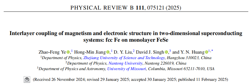 应用物理系量子关联物质研究团队在国际学术期刊《Physical Review B》 (IF=3.71,中科院二区) 期刊上发表了题为“Interlayer coupling of magnetism and electronic structure in two-dimensional superconducting systems: fcc Fe on monolayer FeSe”的研究论文。HO5HO