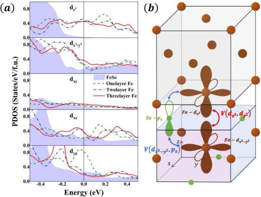 图2:不同厚度fcc Fe覆盖层下1UC FeSe单层的Fe-3d轨道态密度以及层间相互作用。
