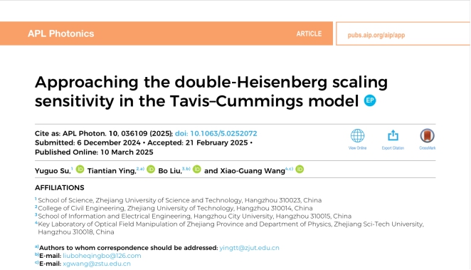 应用物理系量子信息物理研究团队在国际学术期刊《APL Photonics》(IF=5.6,中科院一区)期刊上发表了题为"Approaching the double-Heisenberg scaling sensitivity in the Tavis-Cummings model"的研究论文,该论文被选为Editor's Pick(编辑精选)。(Editor's Picks serve to highlight articles with excellent scientific quality and are representative of the work taking place in a specific field)。HO5HO