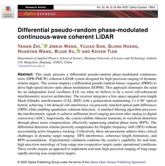 应用物理系光子与光场调控研究团队在相干激光雷达研究方面取得重要进展,相关研究成果以研究论文形式发表在国际光学领域知名期刊《Optics Express》上。论文题为“Differential pseudo-random phase-modulated continuous-wave coherent LiDAR”,全文23页,附图11张,约3.3万字。职亚楠副研究员为论文第一作者/通讯作者,研究生王金凯为第二作者,其他作者依次是孙玉娇、黄思婧、王欢颜、徐弼军教授和田克汉教授,HO5HO