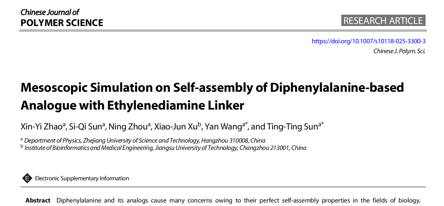 软物质与功能纳米材料研究团队在“短肽衍生物自组装领域”取得重要的研究进展,相关研究成果以浙江科技大学为第一单位在国际期刊《Chinese Journal of Polymer Science》(IF = 4.1,中科院SCI二区,JCR Q1)上,在线发表题目为“Mesoscopic Simulation on Self-assembly of Diphenylalanine-based Analogue with Ethylenediamine Linker”的论文。物理学硕士研究生赵欣怡为该论文第一作者,应用物理系王艳博士和孙婷婷教授为共同通讯作者,HO5HO