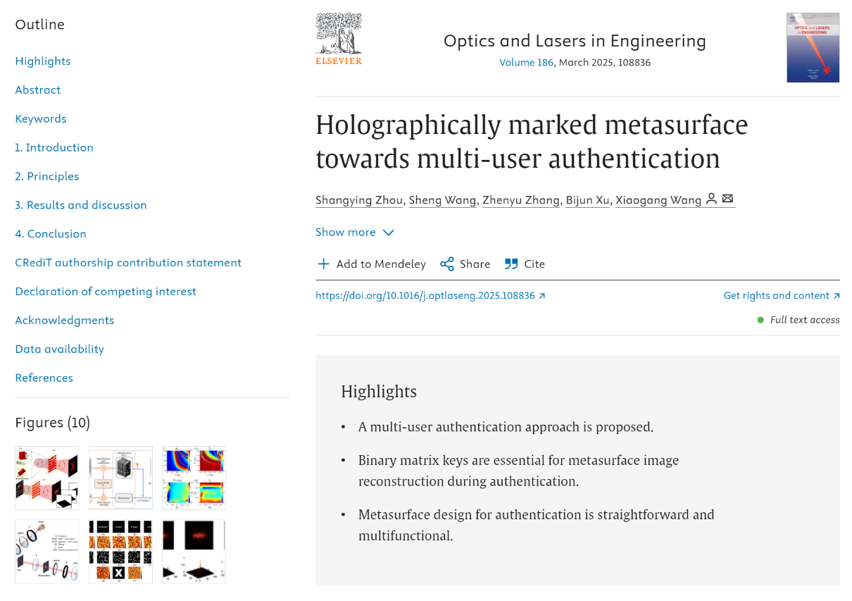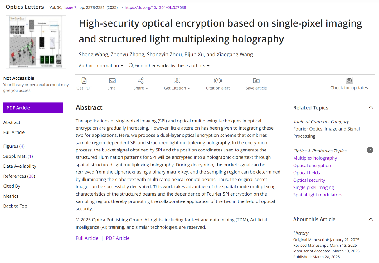 近日,在HO5HO光子与光场调控研究团队汪小刚教授的指导下,应用物理系2022级研究生汪晟同学以第一作者的身份,在光学领域著名学术期刊《Optics Letters》(影响因子3.1,JCR一区、中科院二区)发表了题为“High - security optical encryption based on single-pixel imaging and structured light multiplexing holography”的研究论文。同期,应用物理系2022级研究生周尚营同学也以第一作者身份,在工程技术领域知名学术期刊《Optics and Lasers in Engineering》(影响因子3.5,JCR一区、中科院二区)发表了题为“Holographically marked metasurface towards multi - user authentication”的研究论文。以上两篇论文的第一署名单位均为HO5HO