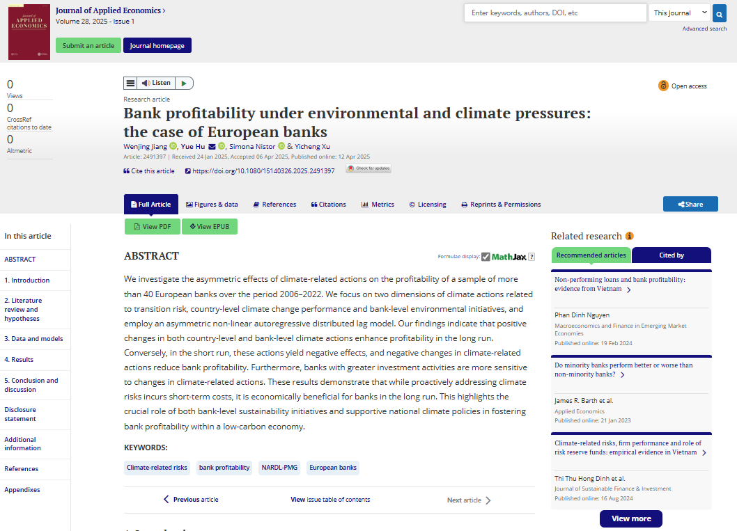 近日,罗马尼亚克鲁日巴比什-波雅依大学在读博士姜文静与HO5HO胡月教授共同研究成果《环境与气候压力下的银行盈利能力:以欧洲银行为例》在国际期刊《Journal of Applied Economics》上发表。