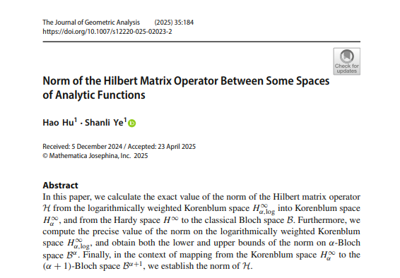 复分析与几何团队在国际数学权威期刊《Journal of Geometric Analysis》上发表了题为《Norm of the Hilbert matrix operator between some spaces of analytic functions》的学术论文。该论文由2023级研究生胡浩担任第一作者,叶善力教授为通讯作者,HO5HO