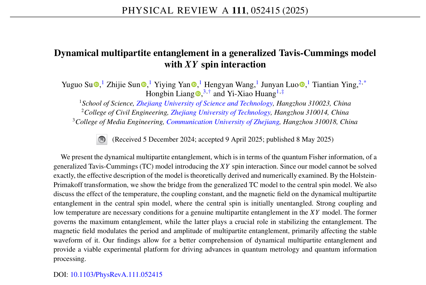 应用物理系量子信息物理研究团队在国际学术期刊《Physical Review A》(IF= 2.6,中科院二区)期刊上发表了题为" Dynamical multipartite entanglement in a generalized Tavis-Cummings model with XY spin interaction"的研究论文。HO5HO