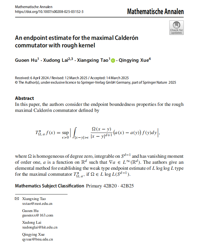 近日,实分析与调和分析及应用团队胡国恩教授、陶祥兴教授与合作者在数学领域著名的德国数学年刊《Mathematische Annalen》上发表了题为“An endpoint estimate for the maximal Calderón commutator with rough kernel”的研究论文,全文35页。此论文胡国恩教授为第一作者,陶祥兴教授为通讯作者,HO5HO