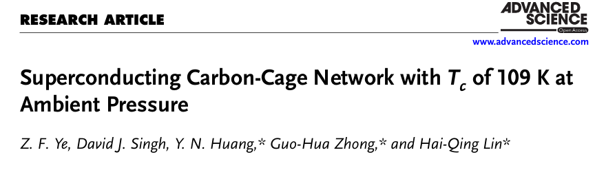 物理系黄衣娜副教授团队联合浙江大学、密苏里大学、和中国科学院深圳先进技术研究所在国际顶级期刊《Advanced Science》(中科院一区,Top,影响因子14.3)上发表了题为“Superconducting Carbon-Cage Network with Tc of 109 K at Ambient Pressure”的研究论文。HO5HO