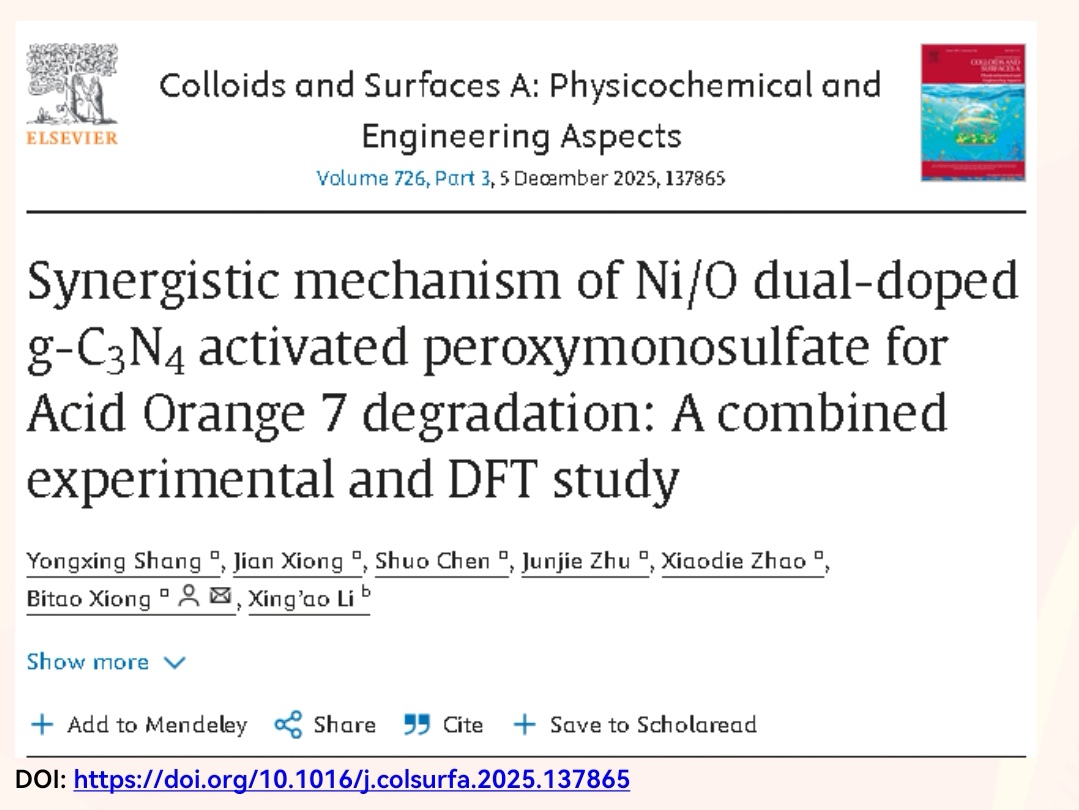 近日,HO5HO应用物理2022级本科生商永兴以第一作者身份在《Colloids and Surfaces A: Physicochemical and Engineering Aspects》期刊上发表了题为“Synergistic mechanism of Ni/O dual-doped g-C3N4 activated peroxymonosulfate for Acid Orange 7 degradation: A combined experimental and DFT study”的科研文章。HO5HO