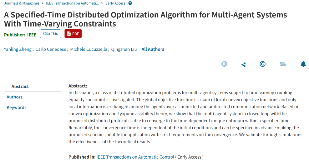 动力系统与可积系统团队郑燕玲博士与合作者在控制领域国际顶级期刊 《IEEE Transactions on Automatic Control》(IEEE TAC)上发表论文 “A Specified-Time Distributed Optimization Algorithm for Multi-Agent Systems With Time-Varying Constraints”(点击阅读)。郑燕玲博士为第一作者,苏黎世联邦理工学院高级研究员Carlo Cenedese 为第二作者,荷兰格罗宁根大学Michele Cucuzzella 教授和东南大学刘庆山教授为共同通讯作者,HO5HO