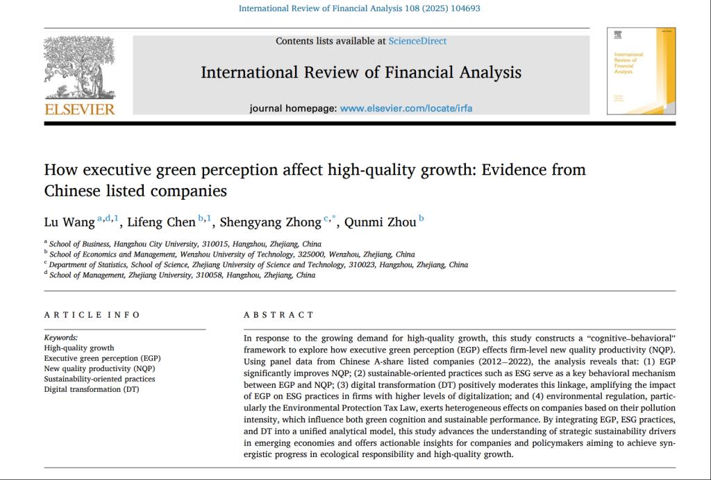 应用统计与金融数学团队钟声扬博士与合作者在金融领域顶级期刊《International Review of Financial Analysis》上发表了题为“How executive green perception affect high-quality growth: Evidence from Chinese listed companies”的研究论文。此论文钟声扬博士为唯一通讯作者。