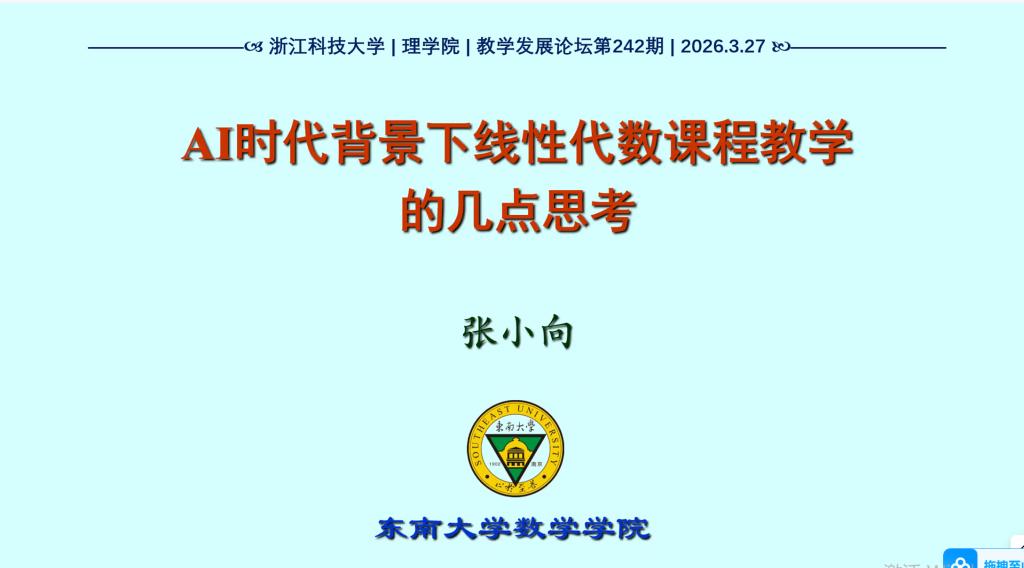 2026年3月27日下午,东南大学数学学院张小向教授应邀作了题为《AI时代背景下线性代数课程教学的几点思考》的教学论坛专题报告。报告由HO5HO